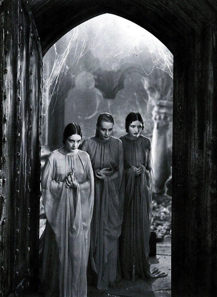 The bride's gowns contrast dramatically with Dracula's gloomy, ominous tones. The use of translucent textiles and trailing silhouettes give them an almost ghostly aspect, emphasising their existence outside the realm of the living, trapped between life and death. Furthermore, their costumes emphasise their dual roles as objects of desire and agents of vampire seduction. The use of flowing fabric enhances their sexuality, particularly during the scene where they interact with Renfield, portrayed by Dwight Frye. The brides embody the gothic ideal of beauty in death, blending sensuality and mortality. The outfits visually symbolise the women's dual positions as victims and predators in Dracula's realm, highlighting the film's complex commentary on desire and corruption.