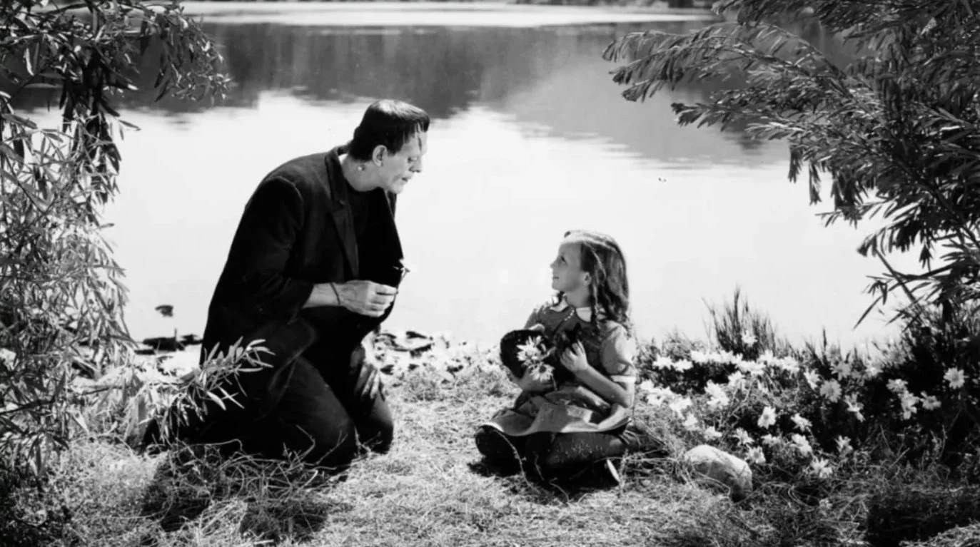 Frankenstein's earlier scenes in the oppressive laboratory stand in stark contrast to this new, picturesque landscape. Due to his own isolation, Frankenstein misinterprets other characters, which ultimately results in tragedy. Sadly, if the Monster didn't have a physically grotesque form, the natural greenery suggests a world in which he might reside.The Monster and Maria's interactions are the main emphasis of the scene's final moments, and the set design and camera angles enhance the scene's overall emotional impact and intensity. Boris Karloff's acting and physical gestures accentuate his imposing presence, which contrasts with the vast, picturesque area that envelops him. His physical presence next to Maria, who is playful and sincere, emphasises how otherworldly he is.